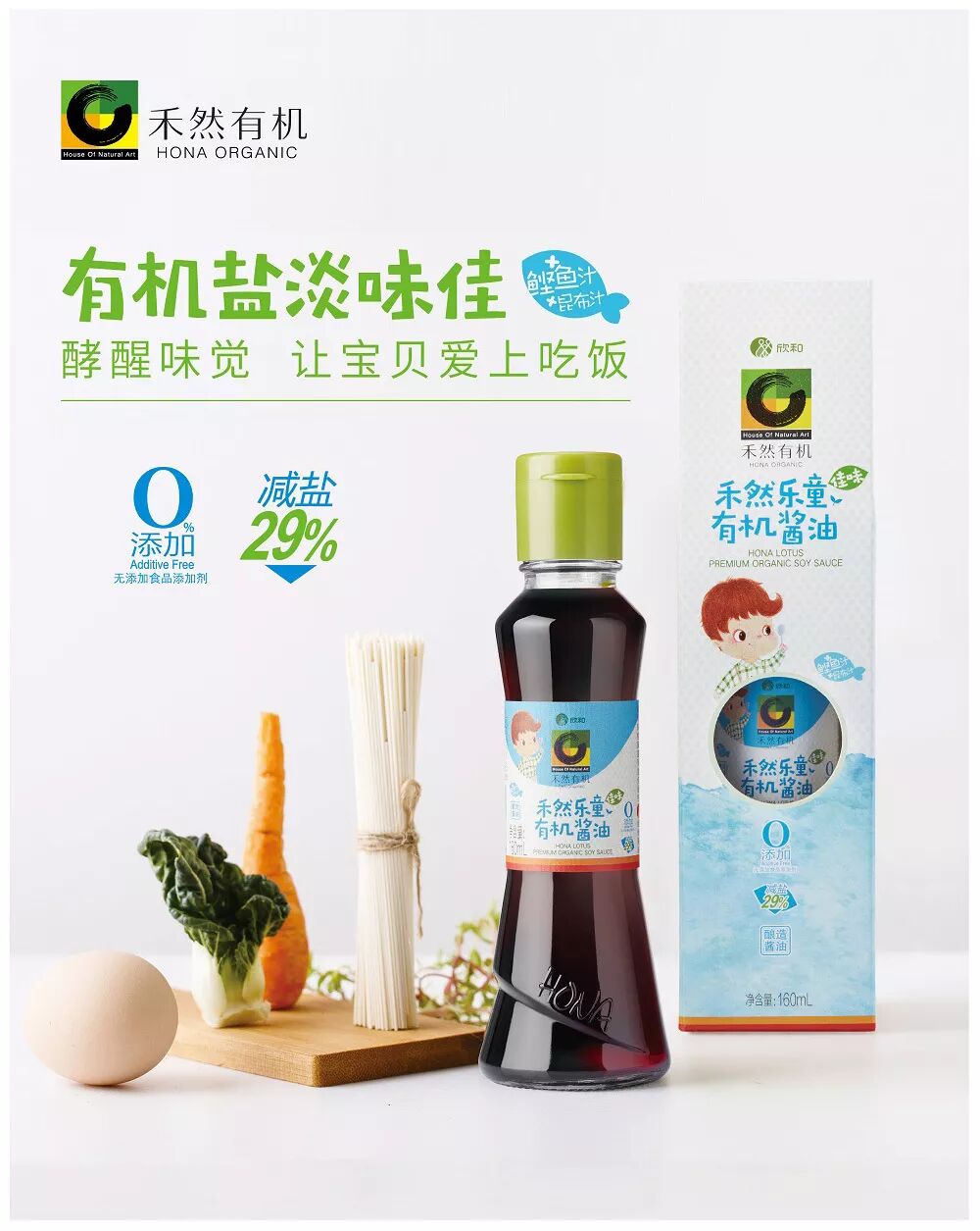 禾然乐童佳味有机酱油,只选天然有机原料,全称恒温足期密闭酿造,0%添加,特有减盐工艺,减盐29%,添加了鲣鱼汁和昆布汁,不减营养,低盐更美味,口感柔和,保护宝贝娇嫩的味蕾,还原食物纯真的味道。