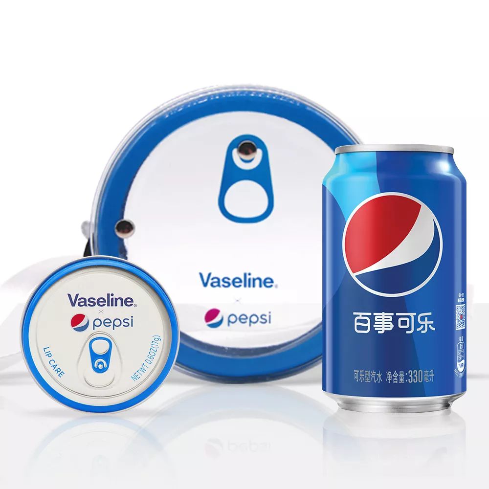 Pepsi×Vaseline跨界新品、限量发售! 1.百事可乐:330ml全“心”包装热爱全开。 2.Pepsi×Vaseline联名定制的小铁罐护唇膏:此款护唇膏是定制的汽水香味,凡士林明星成分微凝晶冻,护唇滋润少不了。 3.Pepsi×Vaseline联名定制潮流背包:采用PVC材质,直径15cm。